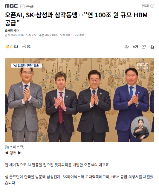 첫 번째 뉴스, 챗GPT 개발사 오픈AI의 기업가치가 5000억 달러로 평가받으며 머스크의 스페이스X 4000억 달러를 제치고 세계 최대 스타트업이 됐습니다. 오픈AI는 현재 엔비디아 등과 함께 수조 달러를 투입해 전 세계적으로 데이터 센터를 구축하고 AI 서비스를 개발하는 흐름을 주도하고 있는데요. 샘 올트먼 CEO는 지난 1일 이재명 대통령을 만나 한국에 초대형 AI데이터 센터를 만들기로 하고 삼성전자, SK하이닉스와 HBM 공급 의향서를 체결하는 등 한국과의 협력을 늘려가고 있습니다.
